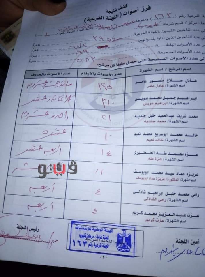 الحصر العددي للجنة الفرعية رقم 163 بقليوب عويس ٣١٠ أصوات و عامر١٢٥