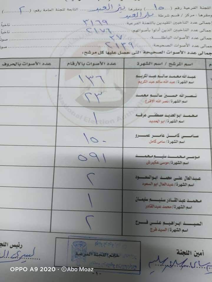 الحصر العددي لأصوات المرشحين بلجنة ١٥ في بئر العبد بشمال سيناء