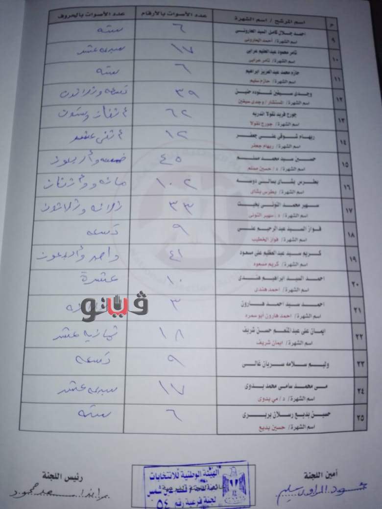 35 صوتًا، والمرشح رقم 5 يسري جبرة على 54 صوتًا، والمرشح رقم 16 بطري بشاى على 102 صوت، والمرشح رقم 29 صلاح غباشي على 81 صوتًا.