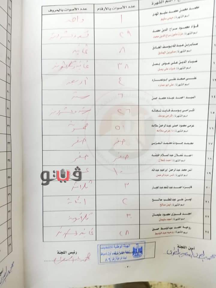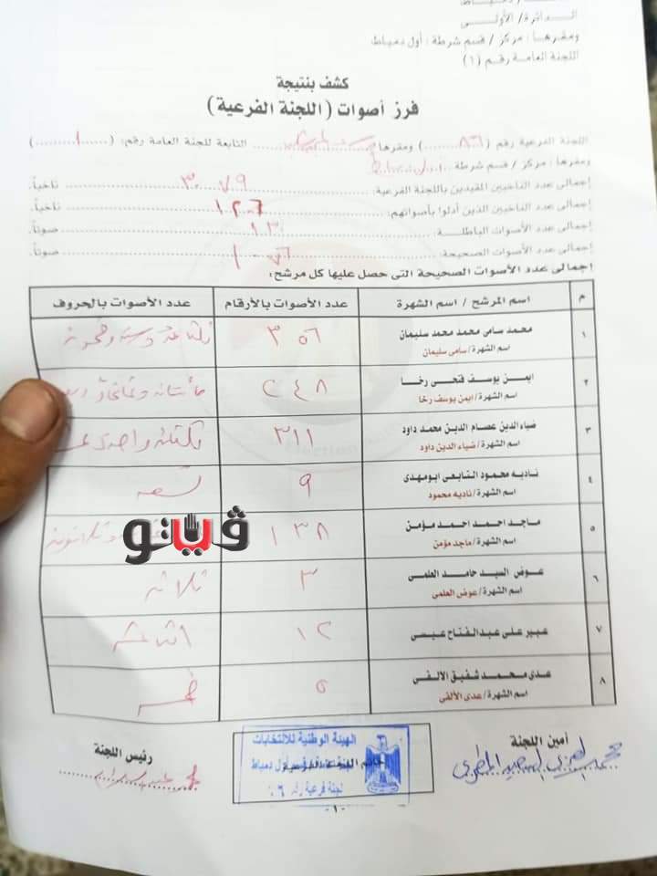 أظهرت عمليات الفرز باللجنة الفرعية رقم 86 بمركز اول دمياط، عن الحصر العددى لأصوات المرشح محمد سامى سليمان 356 صوت، وايمن رخا 248 صوت، وضياء داوود 311 صوت، ومسعود عبد النعيم 626 .