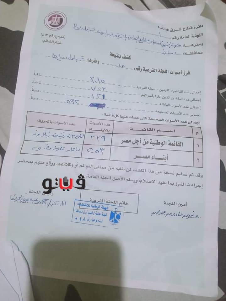 كما اظهر الحصر العددى فى اللجنة الفرعية 48 بدمياط، القائمة الوطنية من اجل مصر 339 صوت وقائمة ابناء مصر 253 صوت، بينما اظهر الحصر العددى فى اللجنة الفرعية 146 بدمياط، القائمة الوطنية 284 وقائمة ابناء مصر 204 صوت.