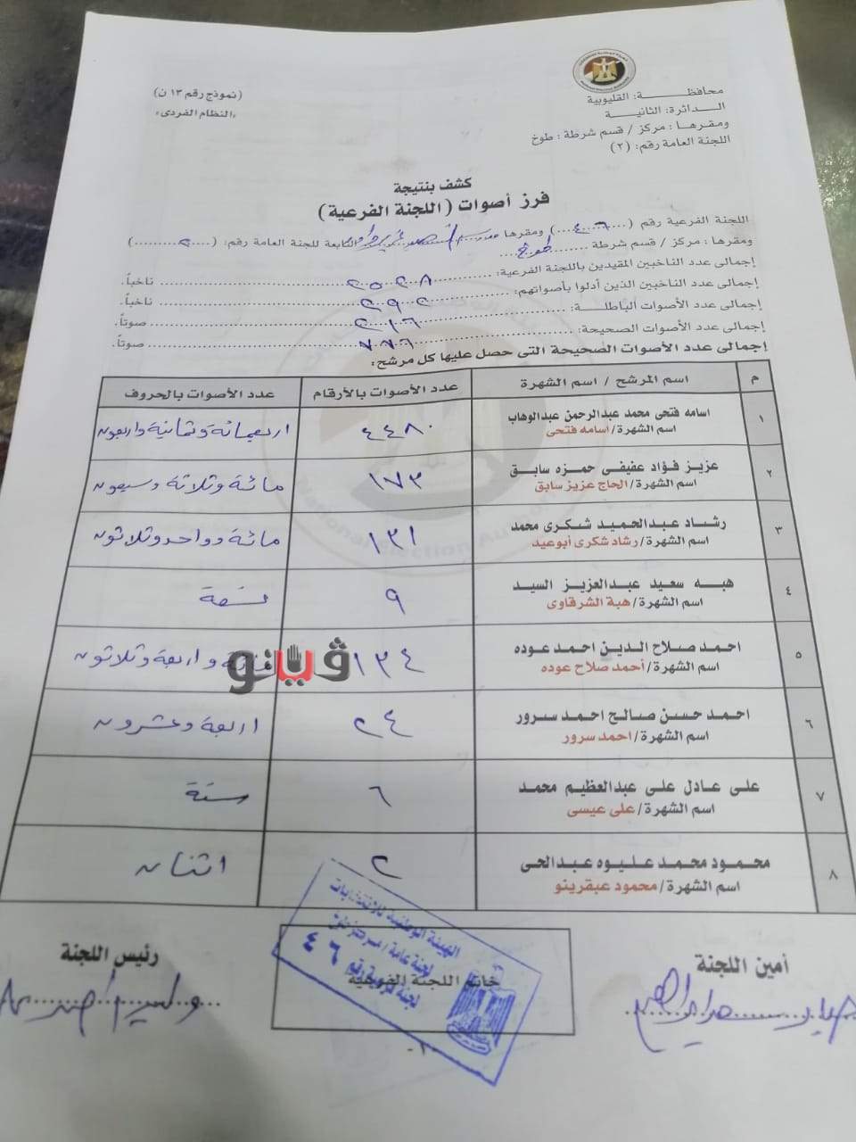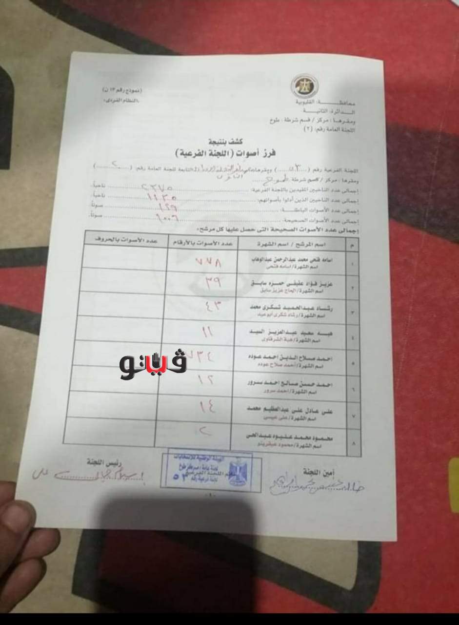 للأصوات باللجنتين الفرعيتين رقمي 46 و53، ومقرها مركز طوخ بمحافظة القليوبية حصول المرشح أسامة فتحي