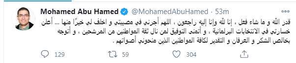 محمد أبو حامد يعلن خسارته في الانتخابات: "إنا لله وإنا إليه راجعون.. اللهم أجرني في مصيبتي"