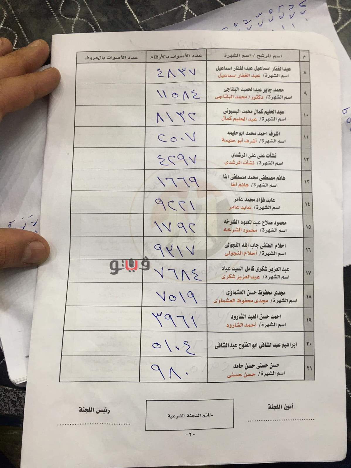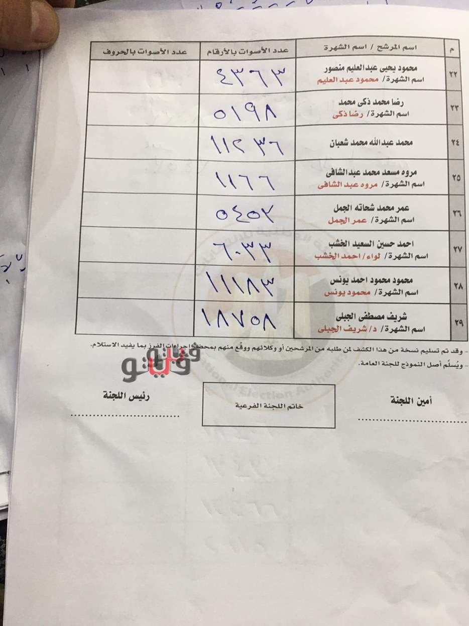 محمد وفيق صالح على 19474 صوتًا، والمرشح شريف الجبلي على 18758، والمرشح إيهاب الفقي 18406 أصوات.