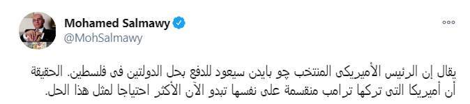 وكتب محمد سلماوي تغريدة على تويتر: "يقال إن الرئيس الأميريكى المنتخب چو بايدن سيعود للدفع بحل الدولتين فى فلسطين. الحقيقة أن أمريكا التى تركها ترامب منقسمة على نفسها تبدو الآن الأكثر احتياجا لمثل هذا الحل"
