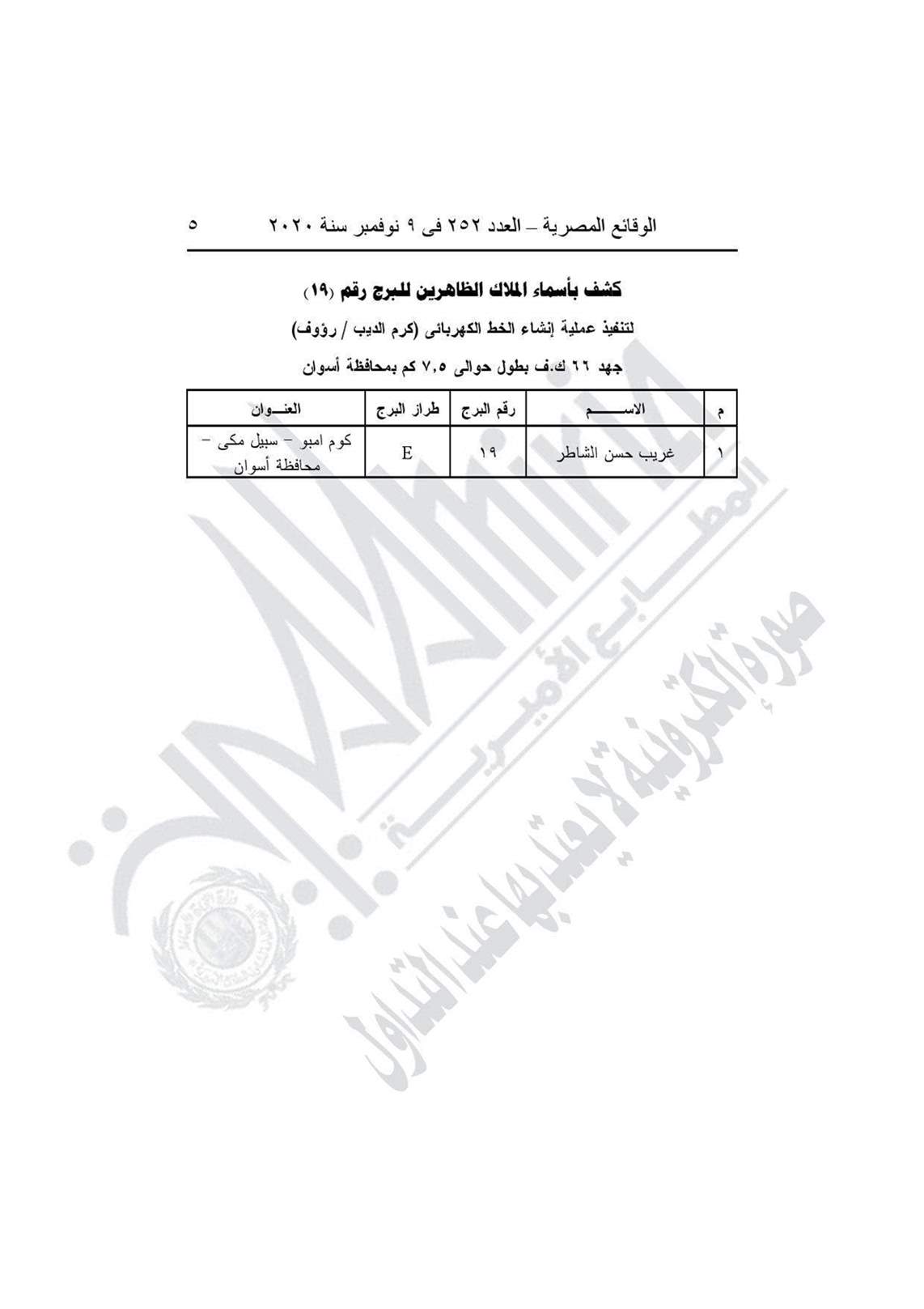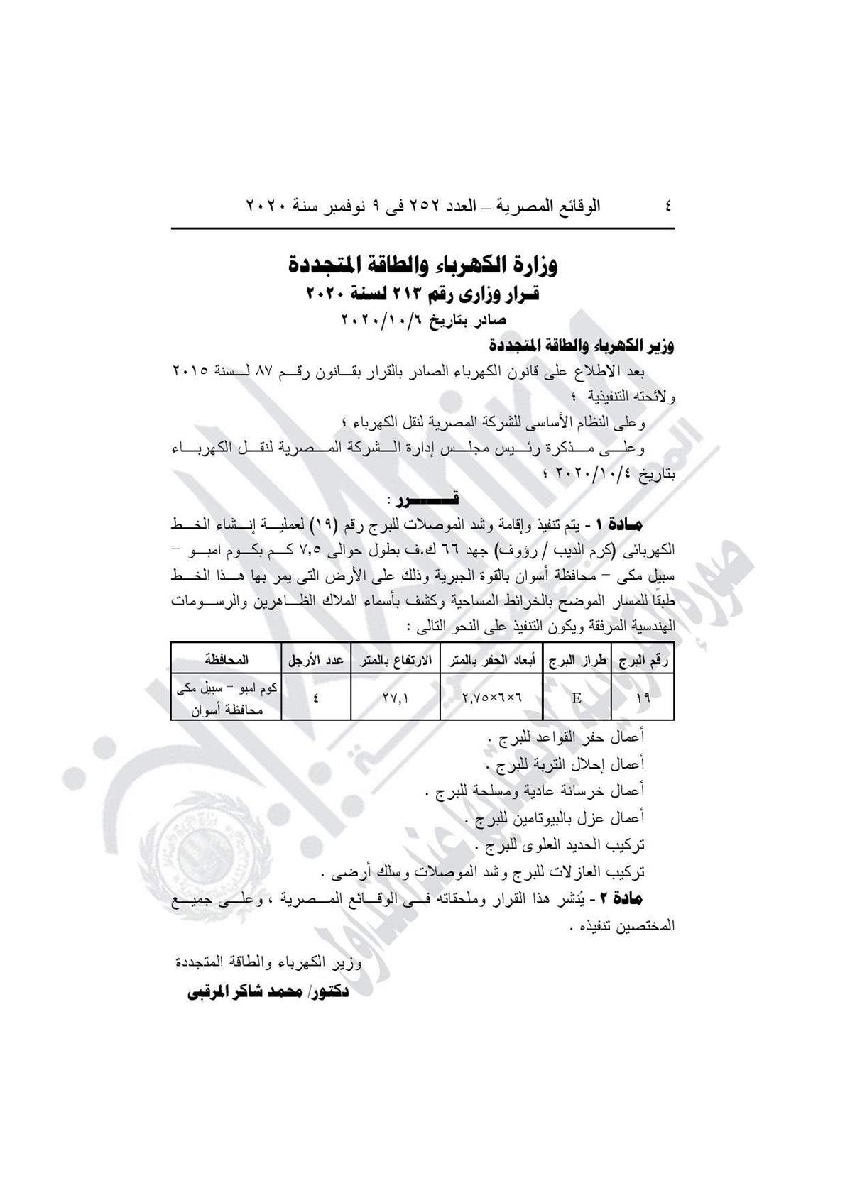وينص القرار على تنفيذ وإقامة وشد الموصلات للبرج رقم (19) لعملية إنشاء الخط الكهربائى (كرم الديب/ رؤوف) جهد 66 ك.ف بطول حوالى 7.5 كيلو متر بكوم امبو- سبيل مكى- محافظة أسوان بالقوة الجبرية، وذلك على الأرض التى يمر بها هذا الخط طبقًا للمسار الموضح بالخرائط المساحية وكشف بأسماء الملاك الظاهرين والرسومات الهندسية.