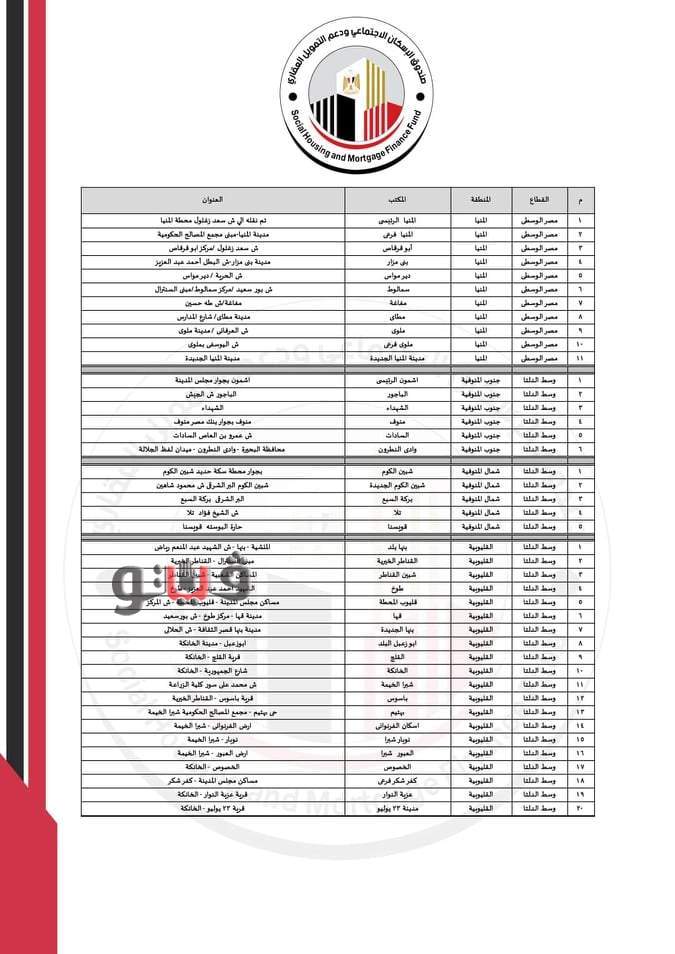 فيما تطرح 100 ألف وحدة سكنية كاملة التشطيب بمشروع الإسكان الاجتماعى لمحدودى الدخل، بـ10 مدن جديدة وهى (بدر "حدائق العاصمة" – حدائق أكتوبر – أكتوبر الجديدة "منطقة غرب المطار" – 15 مايو – العاشر من رمضان – العبور الجديدة – السادات – المنيا الجديدة – ملوى الجديدة – أسوان الجديدة).