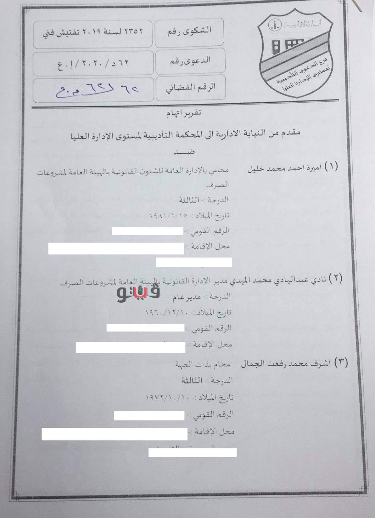 قررت وزارة العدل في القضية رقم 62 لسنة 62 قضائية على إحالة مدير الإدارة القانونية بالإدارة العامة للشئون القانونية بالهيئة المصرية العامة لمشروعات الصرف ومحاميين من مساعديه للمحاكمة بعد ثبوت ارتكابهم مخالفات مالية وقانونية جسيمة.