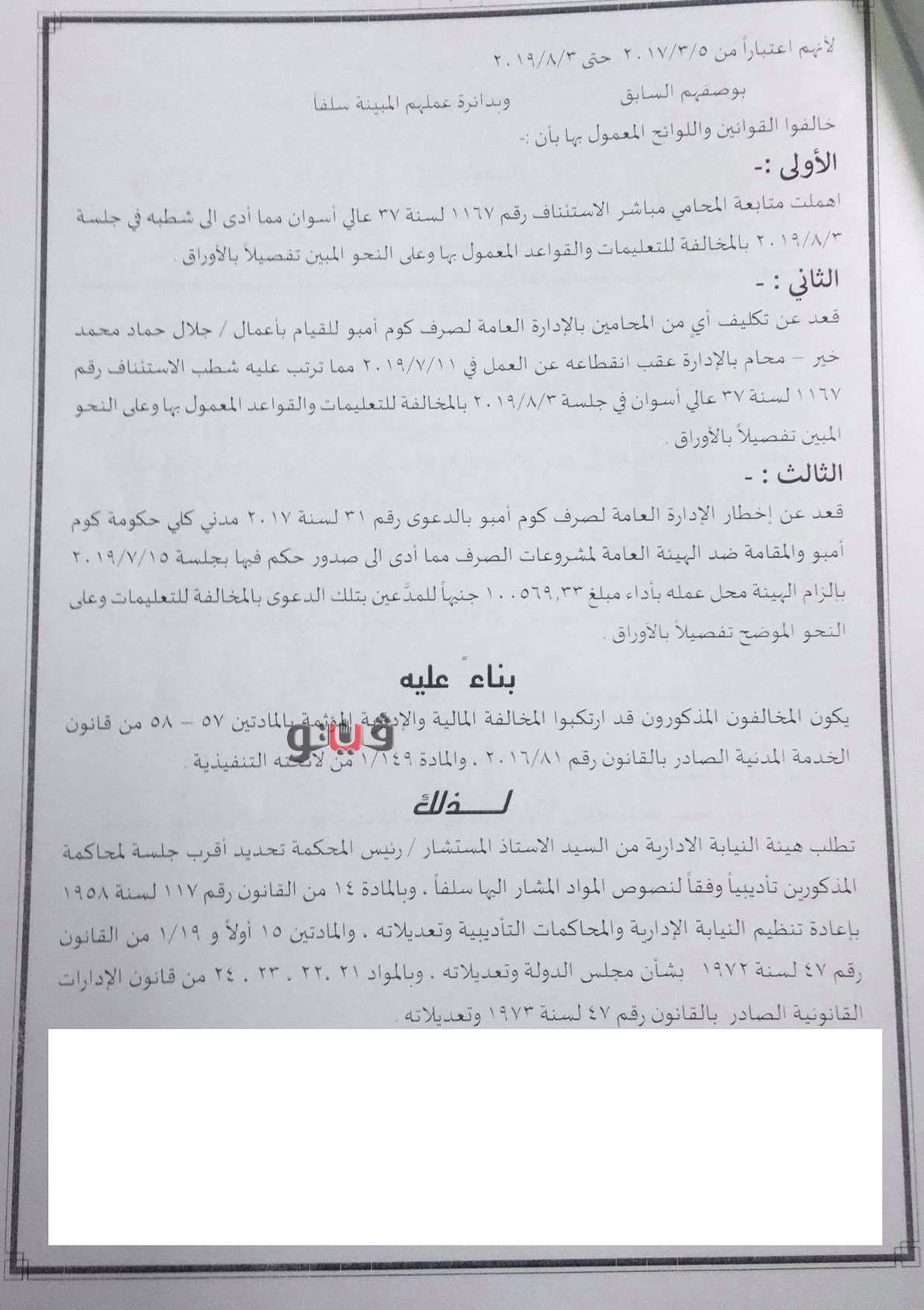 وتبين من أوراق القضية أن نادي عبد الهادي محمد، مدير الإدارة القانونية تقاعس عن تكليف أي من المحامين بالإدارة العامة لصرف كوم إمبو للقيام بأعمال جلال حماد محمد، المحامي بالإدارة عقب انقطاعه عن العمل مما ترتب عليه شطب الاستئناف المشار إليه عاليه.