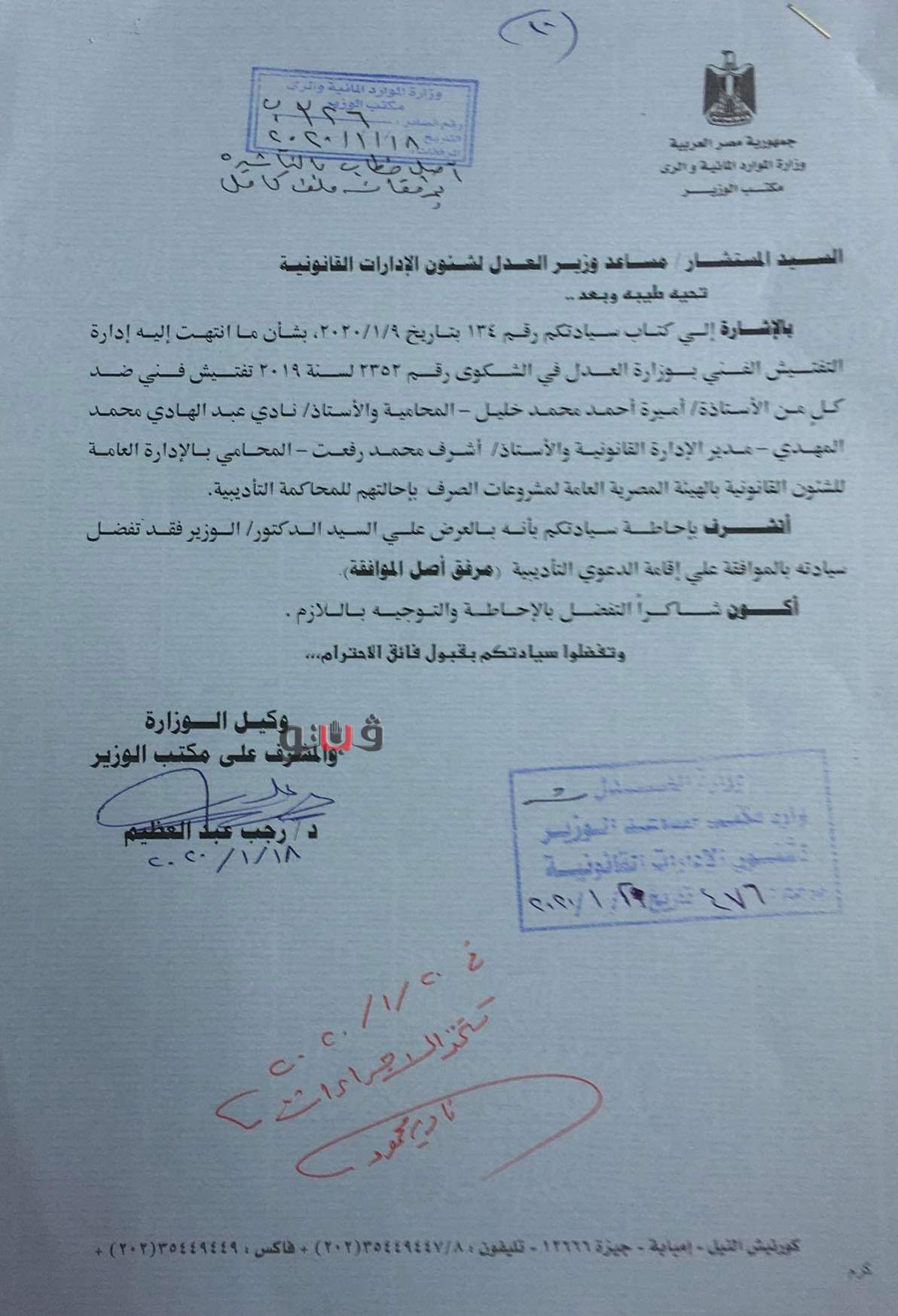 جاء ذلك في خطاب أرسله الدكتور رجب عبد العظيم وكيل وزارة الموارد المائية والري إلى مساعد وزير العدل لشئون الإدارات القانونية ردًا على خطابه رقم 134 بتاريخ 9 يناير 2020 وأرفق بالخطاب أصل موافقة الوزير على إقامة الدعوى التأديبية.
