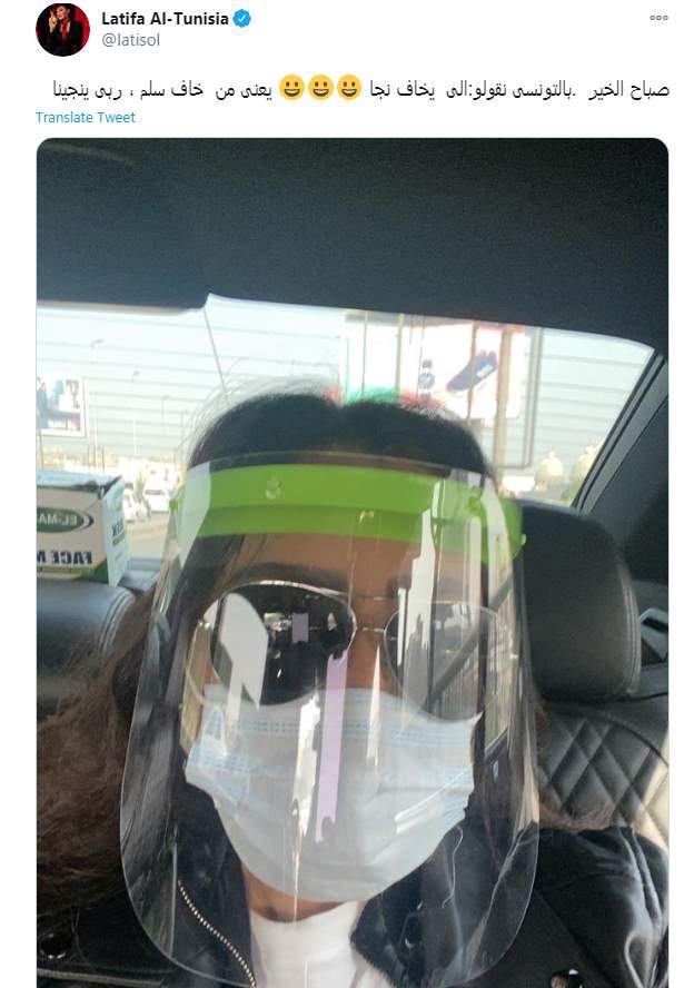 نشرت الفنانة التونسية لطيفة صورة لها مرتدية الكمامة الطبية والقناع الواقي على وجهها، خوفًا من انتشار فيروس كورونا، بعد تزايد أعداد الإصابات بفيروس كورونا، مؤخرًا، في تونس، والتحذيرات التي أطلقتها السلطات التونسية لزيادة أعداد المصابين بفيروس كورونا المستجد كوفيد- 19.