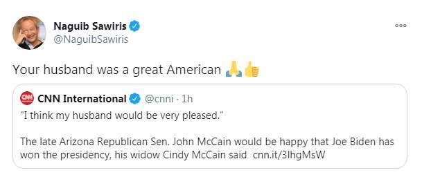 وجاء ذلك تعليقًا على حديث أرملته سيندي ماكين لـCNN مؤكدة أن زوجها السيناتور الجمهوري بولاية أريزونا جون ماكين سيكون سعيدًا بفوز جو بايدن بالرئاسة. قائلة: "أعتقد زوجي سيكون سعيدًا جدًا"