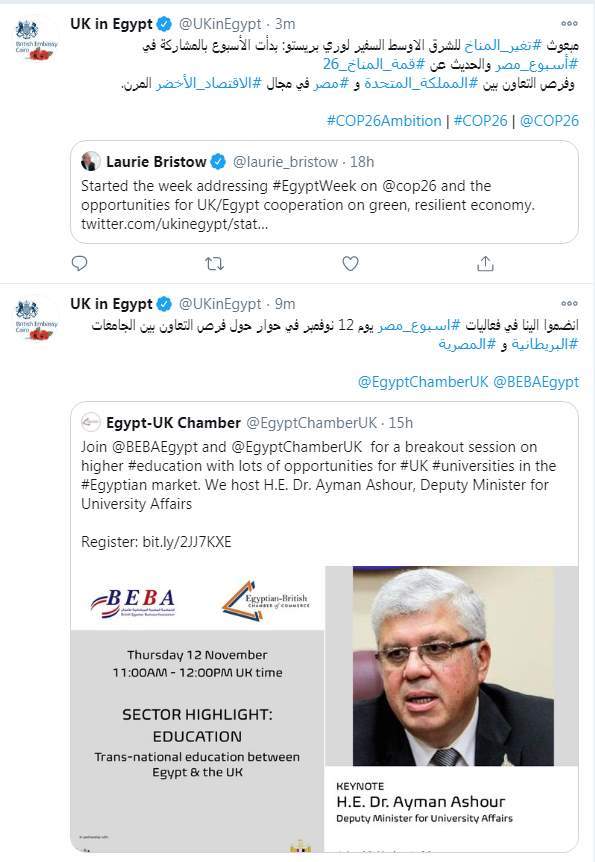 وكتبت السفارة البريطانية بالقاهرة تغريدة على تويتر قالت فيها: "انضموا إلينا في فعاليات #اسبوع_مصر يوم 12 نوفمبر في حوار حول فرص التعاون بين الجامعات #البريطانية و #المصرية".