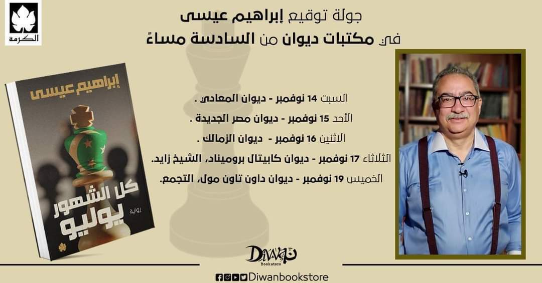 و يستضيف فرع مكتبة ديوان بالمعادي الكاتب إبراهيم عيسى لتوقيع روايته يوم السبت 14 نوفمبر الجاري، في تمام السادسة مساء، فيما يستضيفه فرع المكتبة بمصر الجديدة يوم الأحد 15 نوفمبر.
