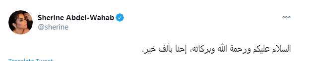 وكتبت شيرين عبد الوهاب تغريدة عبر حسابها الرسمي بتويتر "السلام عليكم ورحمة الله وبركاته، إحنا بألف خير".