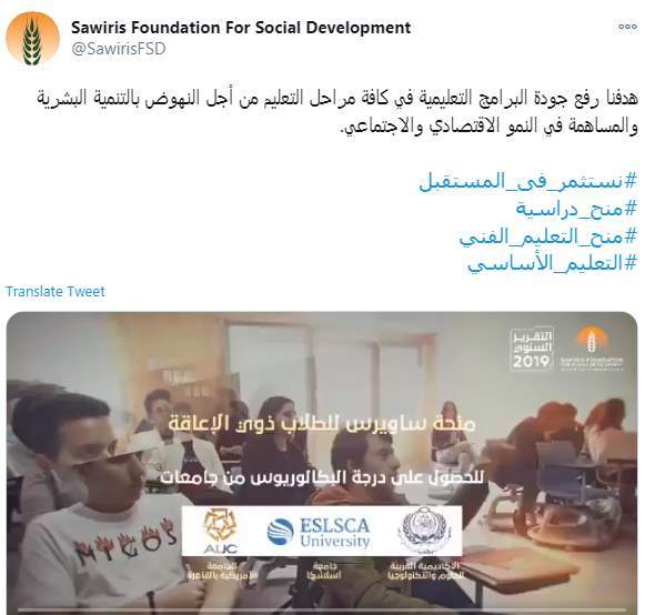 وكتبت مؤسسة ساويرس للتنمية الاجتماعية تغريدة على تويتر قالت فيها: "هدفنا رفع جودة البرامج التعليمية في كافة مراحل التعليم من أجل النهوض بالتنمية البشرية والمساهمة في النمو الاقتصادي والاجتماعي.. #نستثمر_فى_المستقبل #منح_دراسية #منح_التعليم_الفني #التعليم_الأساسي".