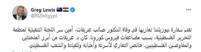 وكتب جريج لويس تغريدة على تويتر قال فيها: "تقدم سفارة نيوزيلندا تعازيها في وفاة الدكتور صائب عريقات، أمين سر اللجنة التنفيذية لمنظمة التحرير الفلسطينية، بسبب مضاعفات فيروس كورونا. كان الدكتور عريقات من أبرز المتحدثين والمفاوضين الفلسطينيين. خالص التعازي لأسرته وأحبابه وللقيادة والشعب الفلسطيني".