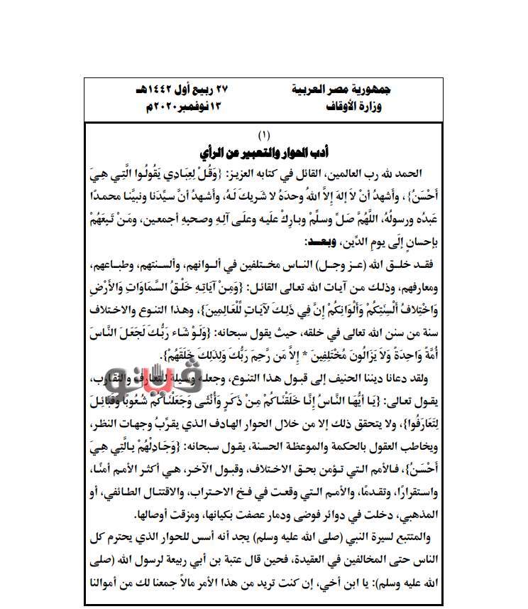 الأوقاف تنشر نص خطبة الجمعة القادمة عن " أدب الحوار والتعبير عن الرأي" | مستند
