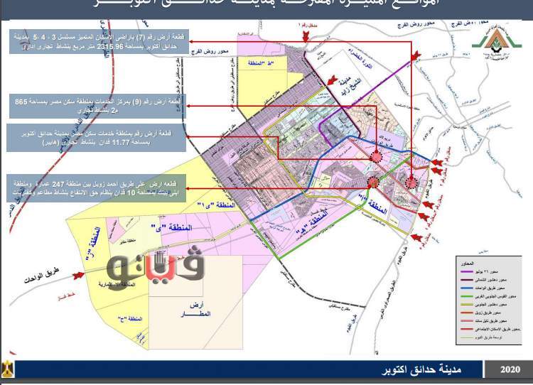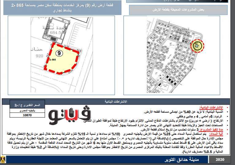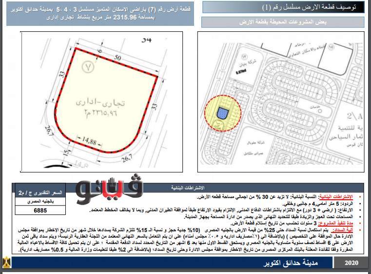 وتطرح بمدينة حدائق أكتوبر ارض بنشاط تجاري اداري بمساحة 2315 متر بسعر 6885 جنيه للمتر، وارض بمساحة 11.5 فدان بسعر 7250 جنيه للمتر وارض بمساحة 10 أفدنة بنظام حق انتفاع.