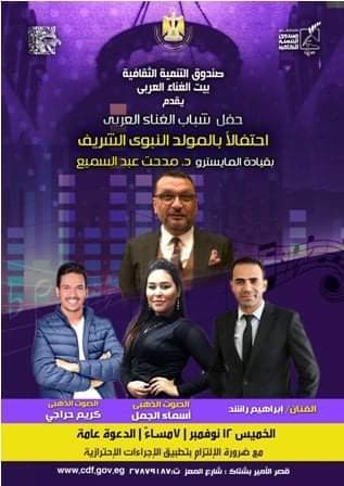 ويتضمن برنامج الحفل عدد من الأغاني الخاصة بذكرى المولد النبوي الشريف بالإضافة إلى عدد من أغاني الزمن الجميل يؤديها عدد من الأصوات الذهبية.