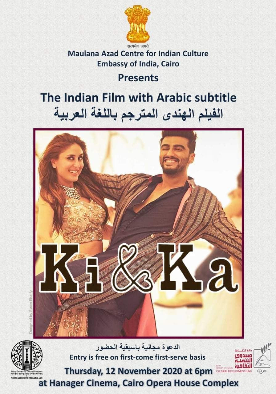 ويعرض هذا الشهر الفيلم الهندي " ki & ka "من إنتاج 2016 تأليف وإخراج بالكي، بطولة كارينا كابور، أرجون كابور.