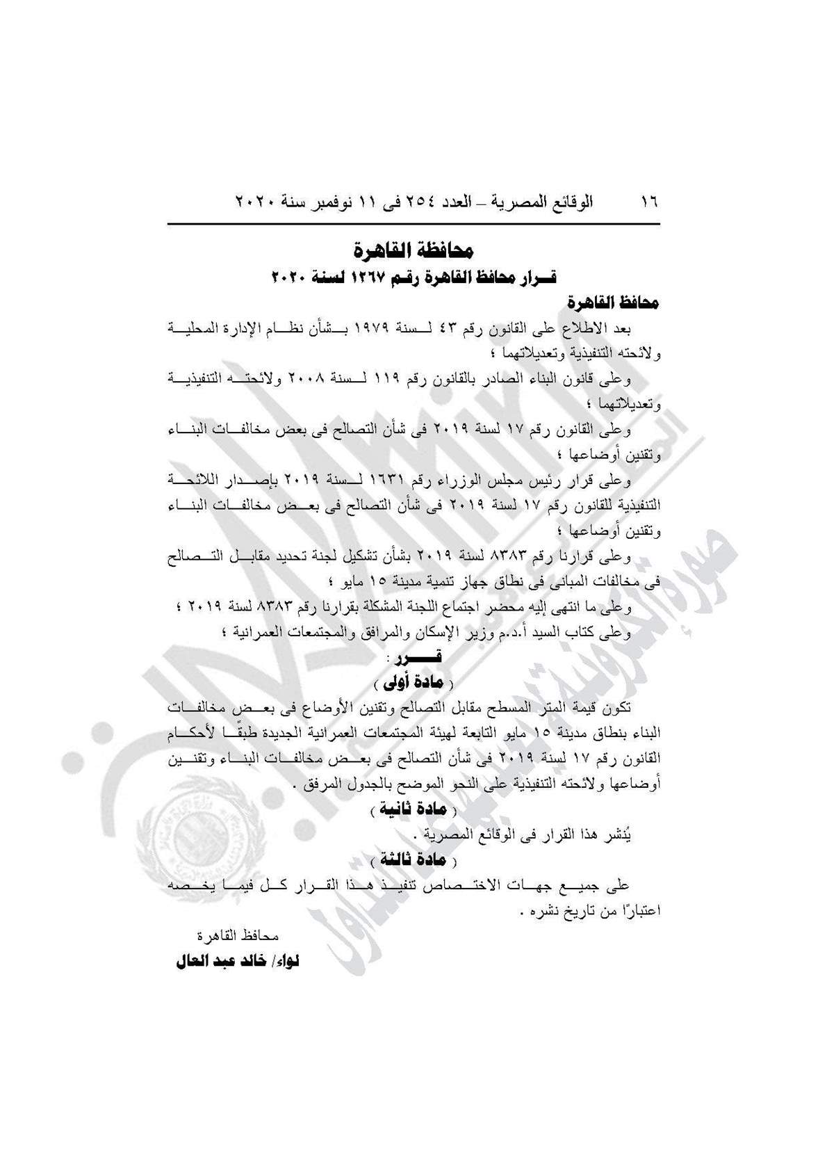 نشرت جريدة الوقائع المصرية في عددها رقم 254، الصادر في 11 نوفمبر 2020، قرار محافظة القاهرة رقم 1267 لسنة 2020، تحديد قيمة المتر المسطح مقابل التصالح وتقنين الأوضاع فى بعض مخالفات البناء بنطاق مدينة 15 مايو التابعة لهيئة المجتمعات العمرانية الجديدة.
