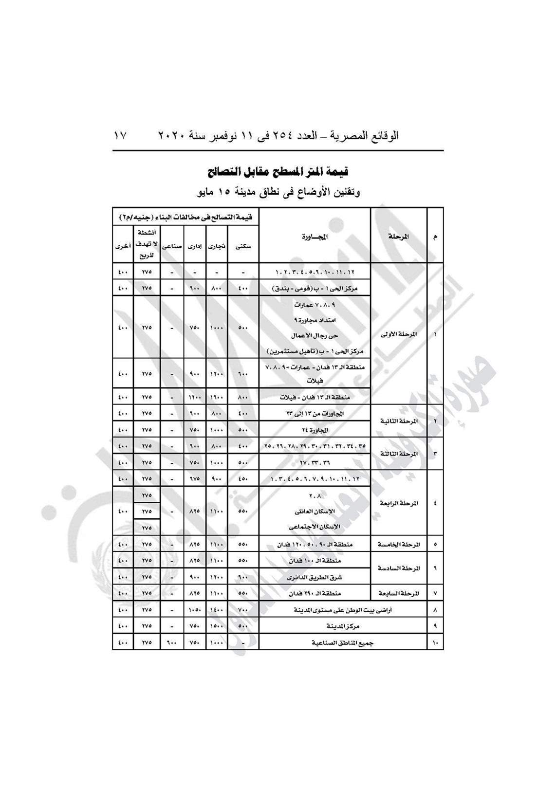 وينص القرار على أن تكون قيمة المتر المسطح مقابل التصالح وتقنين الأوضاع فى بعض مخالفات البناء بنطاق مدينة 15 مايو التابعة لهيئة المجتمعات العمرانية الجديدة طبقًا لأحكام القانون رقم 17 لسنة 2019 فى شأن التصالح فى بعض مخالفات البناء وتقنين أوضاعها ولائحته التنفيذية على النحو الموضح بالجدول.