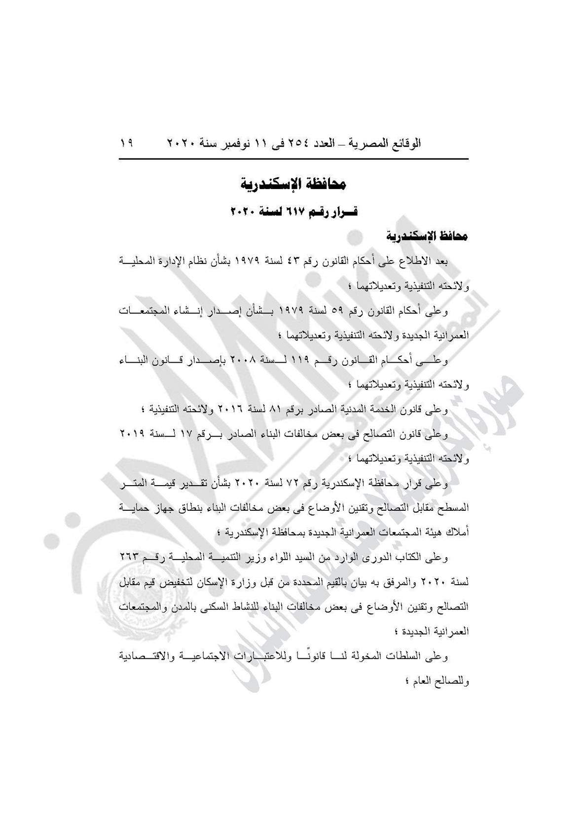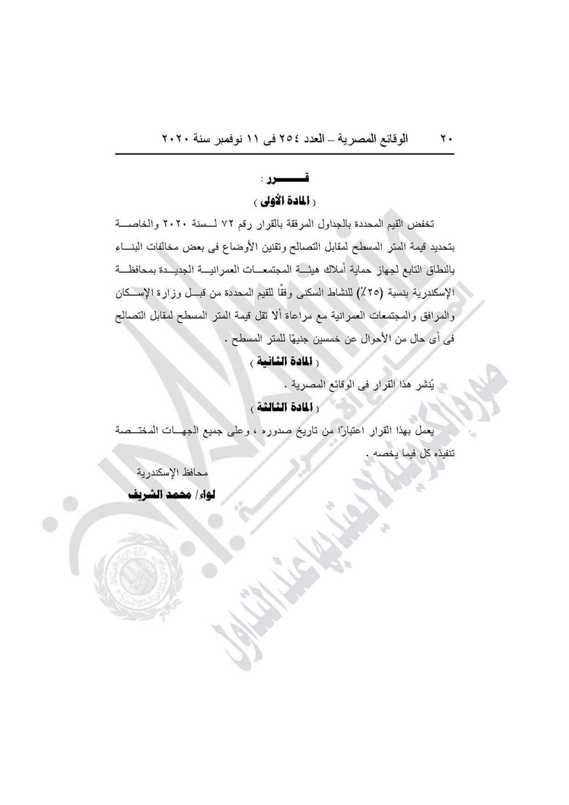 نشرت جريدة الوقائع المصرية في عددها رقم 254، الصادر في 11 نوفمبر 2020، قرار محافظة الإسكندرية رقم 617 لسنة 2020، بشأن تخفيض قيمة المتر المسطح مقابل التصالح في مخالفات البناء بالنطاق التابع لجهاز حماية أملاك هيئة المجتمعات العمرانية الجديدة بمحافظة الإسكندرية بنسبة 25% للنشاط السكني.