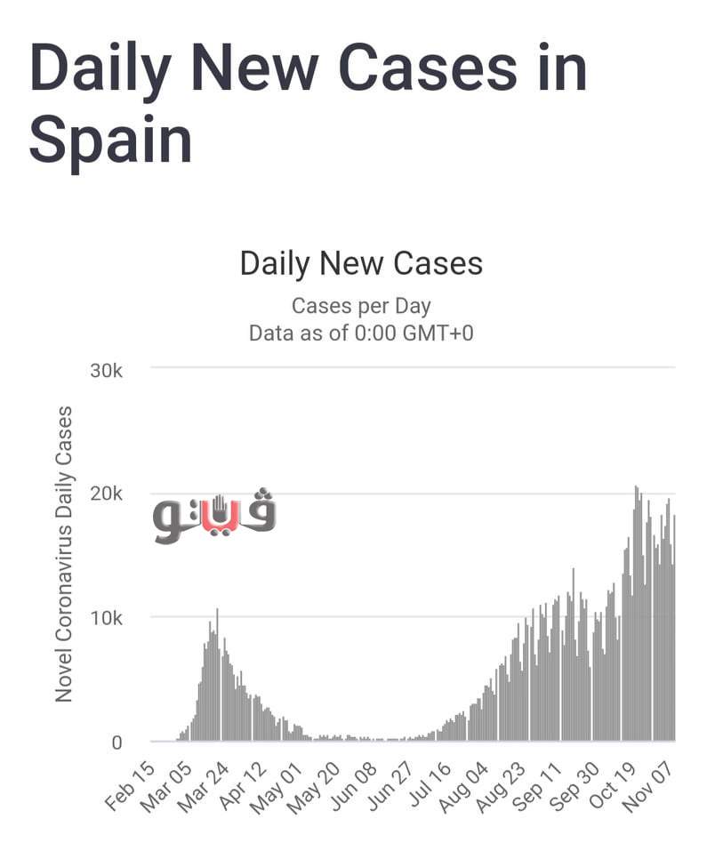 وعرض الدكتور مجدى بدران المنحنى اليومي للكورونا، يبين ضخامة الموجة الثانية للكورونا كوفيد-19 حالياً في أسبانيا.