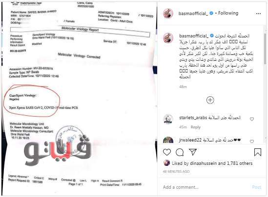 نشرت الفنانة بسمة نتيجة تحليل فيروس كورونا بعد شفائها عبر حسابها على موقع الصور الشهير "إنستجرام".