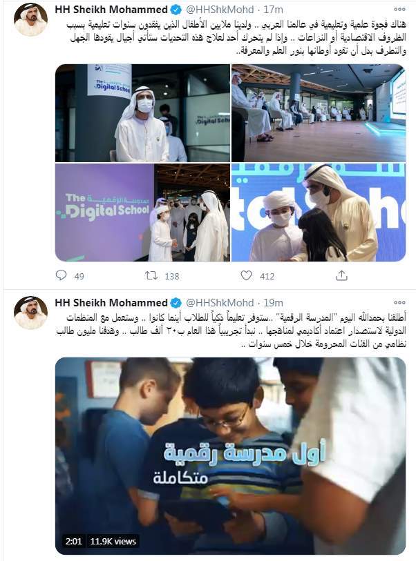 وكتب الشيخ محمد بن راشد آل مكتوم تغريدة على تويتر: "أطلقنا بحمد الله اليوم "المدرسة الرقمية".. ستوفر تعليما ذكيا للطلاب أينما كانوا، وستعمل مع المنظمات الدولية لاستصدار اعتماد أكاديمي لمناهجها".