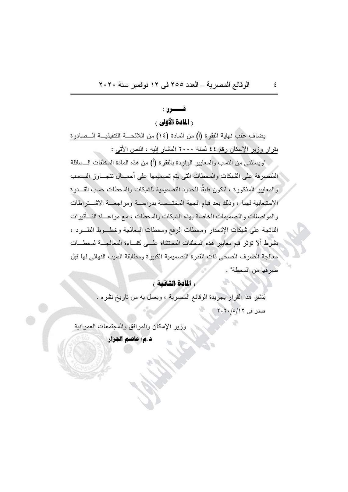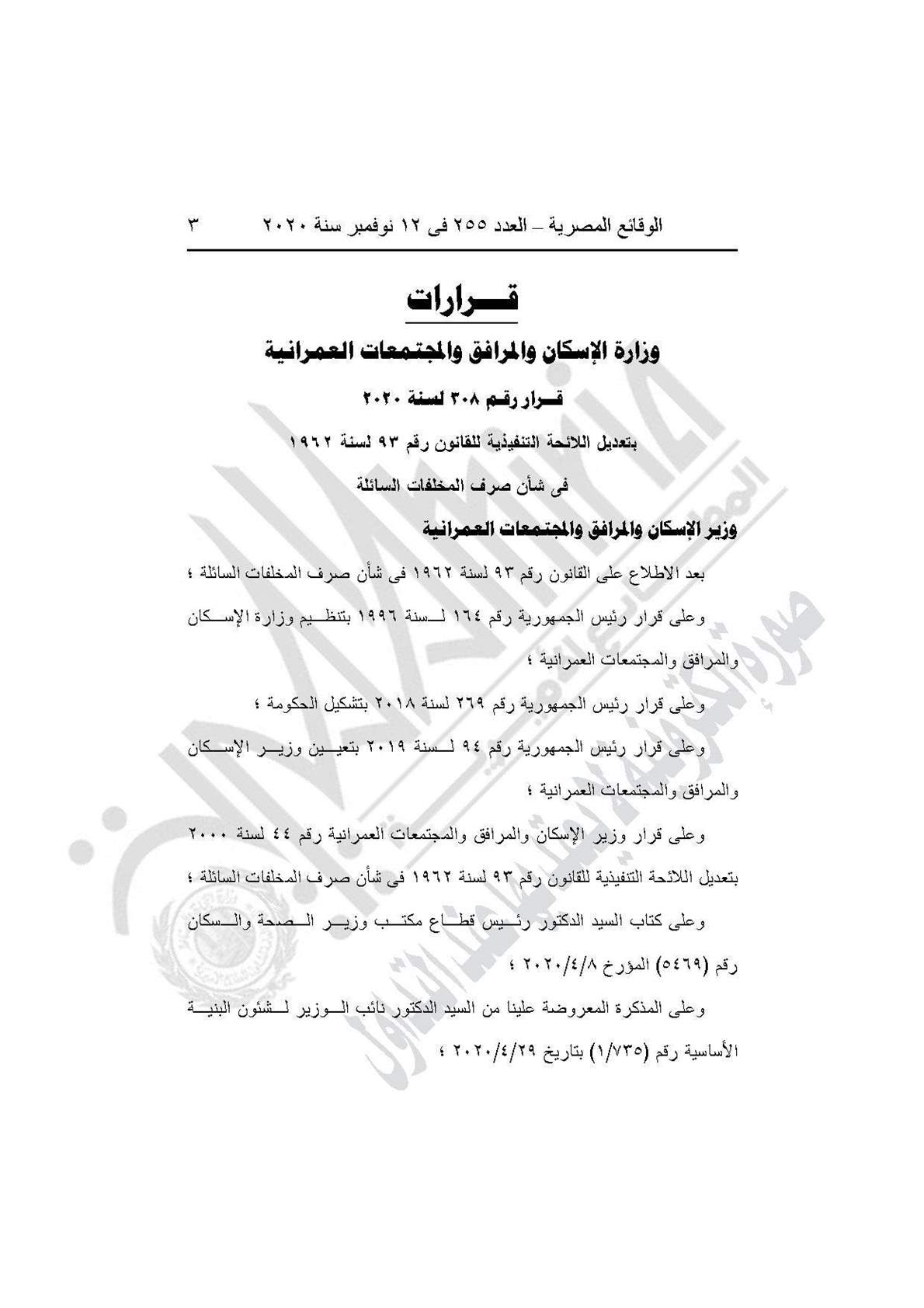 وحمل القرار الاول رقم 308 لسنة 2020، بتعديل اللائحة التنفيذية للقانون رقم 93 لسنة 1962 في شأن صرف المخلفات السائلة.