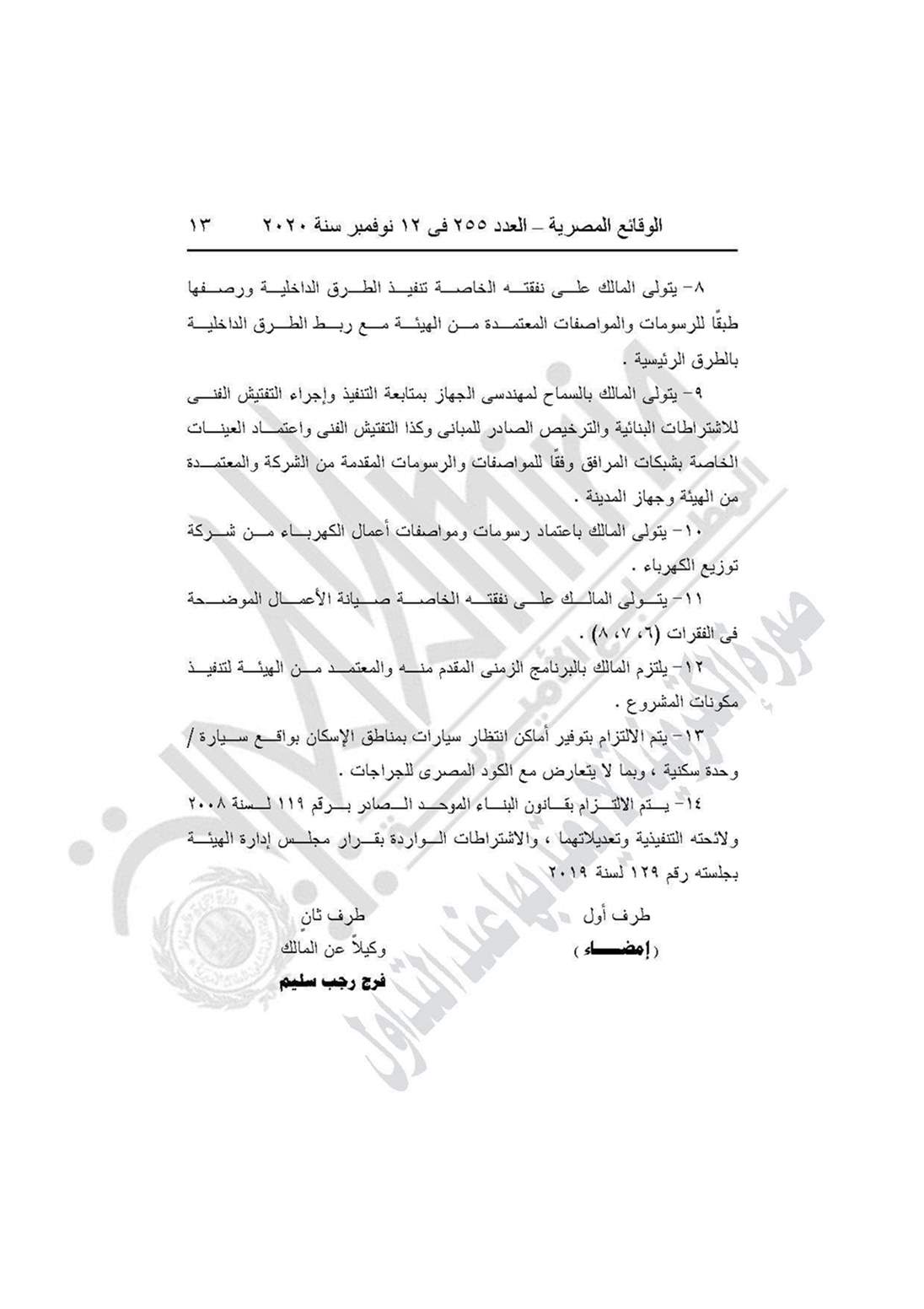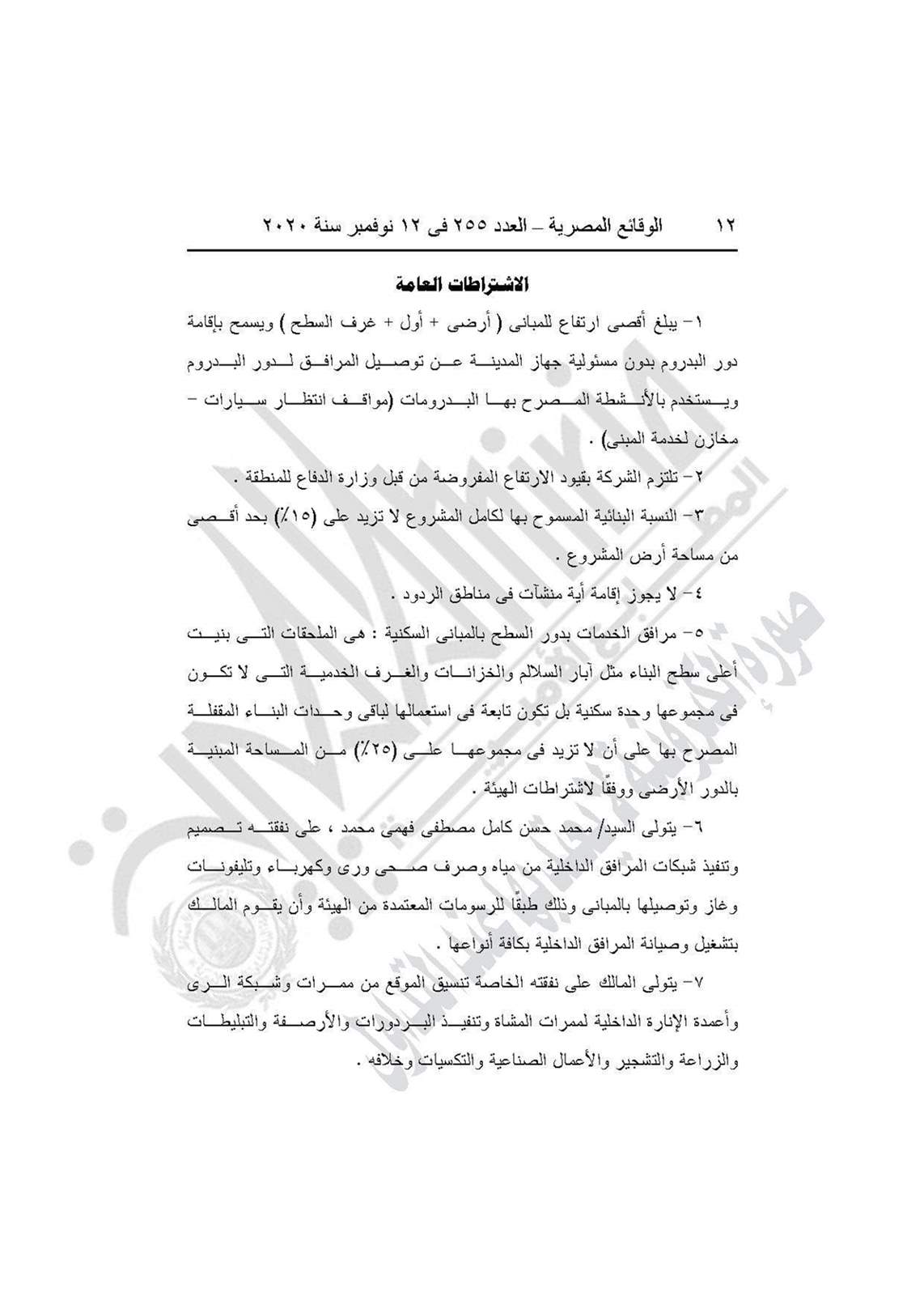نشرت جريدة الوقائع المصرية في عددها رقم 255، الصادر في 12 نوفمبر 2020، قراري وزارة الإسكان والمرافق والمجتمعات العمرانية بتعديل اللائحة التنفيذية للقانون رقم 93 لسنة 1962 في شأن صرف المخلفات السائلة، واعتماد إقامة نشاط سكني بمقابل عيني بالحزام الأخضر بأكتوبر.