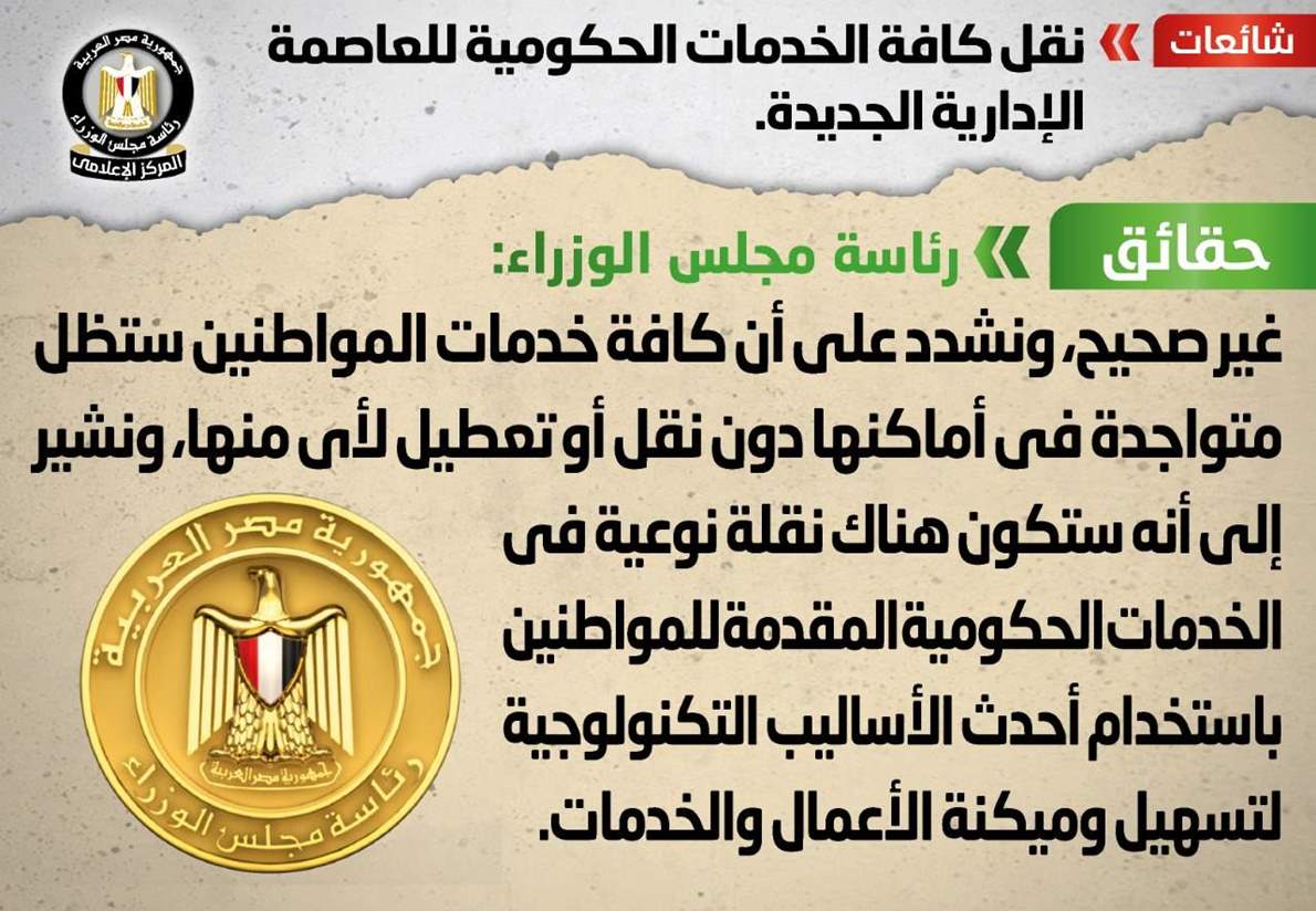 نفي المركز الاعلامي بمجلس الوزراء ما تداولته بعض المواقع الإلكترونية وصفحات التواصل الاجتماعي من أنباء بشأن نقل كافة الخدمات الحكومية للعاصمة الإدارية الجديدة.