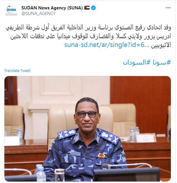 وصل وفد اتحادي سوداني رفيع المستوي، صباح اليوم الخميس، برئاسة وزير الداخلية الفريق أول شرطة الطريفي إدريس لولايتي كسلا والقضارف للوقوف ميدانيًا على تدفقات اللاجئين الثيوبيين للمنطقة الحدودية بالسودان، بحسب وكالة الأنباء السودانية "سونا"
