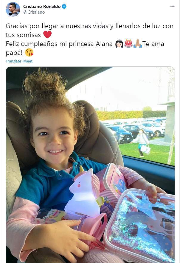 وكتب كريستيانو رونالدو تغريدة على تويتر "شكرًا لمجيئك في حياتي، التي ملأتيها بالنور مع ابتسامتك.. عيد ميلاد سعيد يا أميرتي آلانا.. أحبك.. والدك"