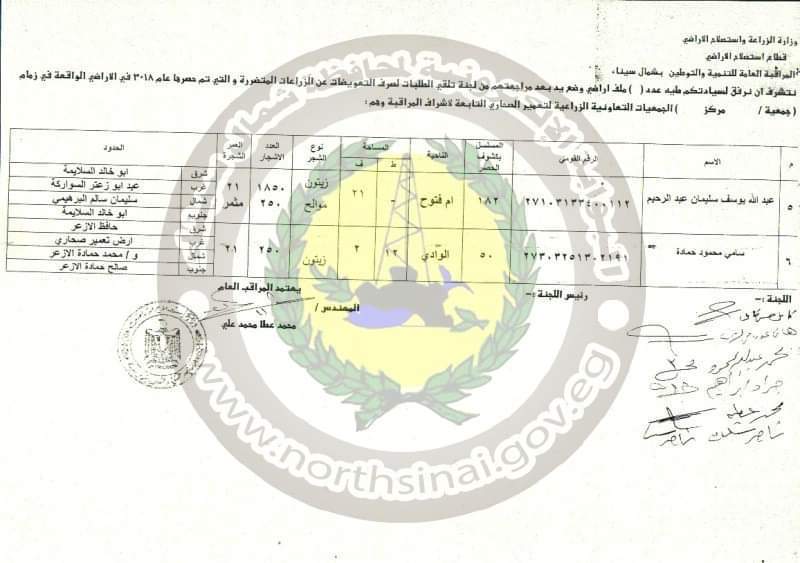 محافظة شمال سيناء تعلن أسماء عدد من المزارعين مستحقي التعويضات