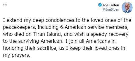 قدم المرشح الديمقراطي الفائز بالانتخابات الرئاسية الأمريكية جو بايدن، تعازيه في الجنود الذين لقوا مصرعهم في حادث سقوط طائرة تابعة لقوات حفظ السلام بالشرق الأوسط، ومن بينهم 6 أمريكيين.