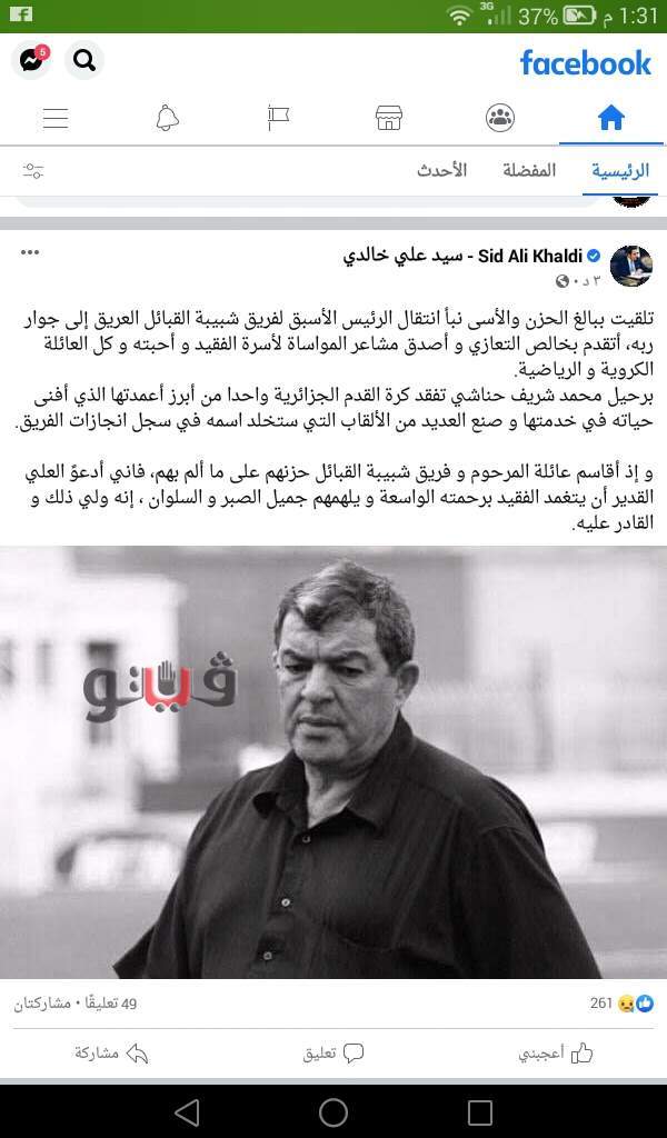 واختتم :"وإذ أقاسم عائلة المرحوم وفريق شبيبة القبائل حزنهم على ما ألم بهم، فاني أدعوً العلي القدير أن يتغمد الفقيد برحمته الواسعة ويلهمهم جميل الصبر و السلوان ، إنه ولي ذلك والقادر عليه".