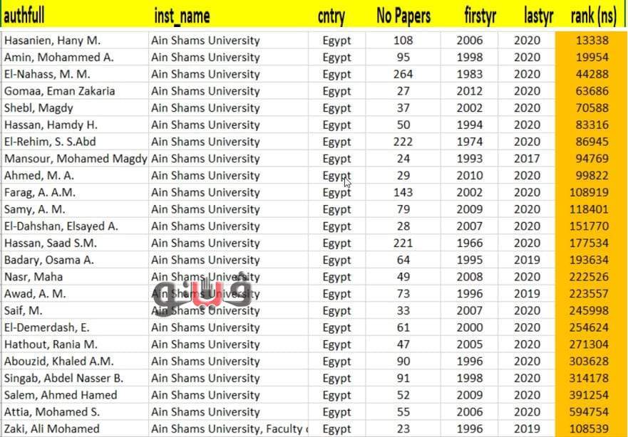 وأشار إلى أنه ضمت "أفضل 2٪ من علماء العالم" وعددهم ما يقرب من ١٦٠ ألف عالم من ١٤٩ دولة، اعتماداً على قاعدة بيانات Scopus td في حوالي ١٧٠ تخصص، حيث ضمت قائمة الشرف ٢٤ من علماء جامعة عين شمس الوارد اسمائهم في الرابط التالي من هنا