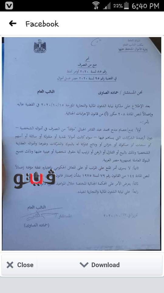 أصدر المستشار حمادة الصاوي النائب العام، الأمر رقم 85 لسنة 2020 في القضية رقم 95 لسنة 2020 حصر غسل أموال، بمنع "ع م.م.ا " أشهر رجل أعمال بمحافظة كفر الشيخ وصاحب تصالح الـ33 مليون جنيه في مخالفات البناء من التصرف في أمواله الشخصية - دون أرصدة الشركات الذي يساهم فيها - سواء كانت أموالا نقدية أو منقولة أو سائلة أو أسهم أو سندات أو صكوك أو خزائن أو ودائع مملوكة له بالبنوك والشركات وغيرها.