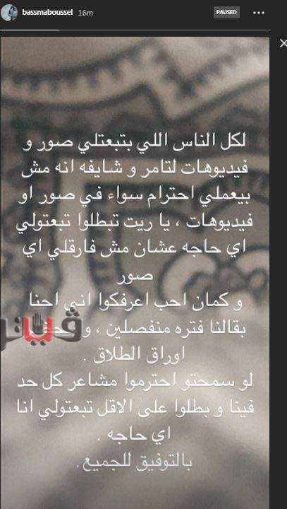 ونشرت بسمة بوسيل استوري عبر صفحتها على انستجرام قالت فيها: "لكل الناس اللى بتبعتلي صور وفيديوهات لتامر وشايفة إنه مش بيعلي احترام سواء في صور أو فيديوهات يا ريت تبطلوا تبعتولي أي حاجة عشان مش فارقلي أي صور".
