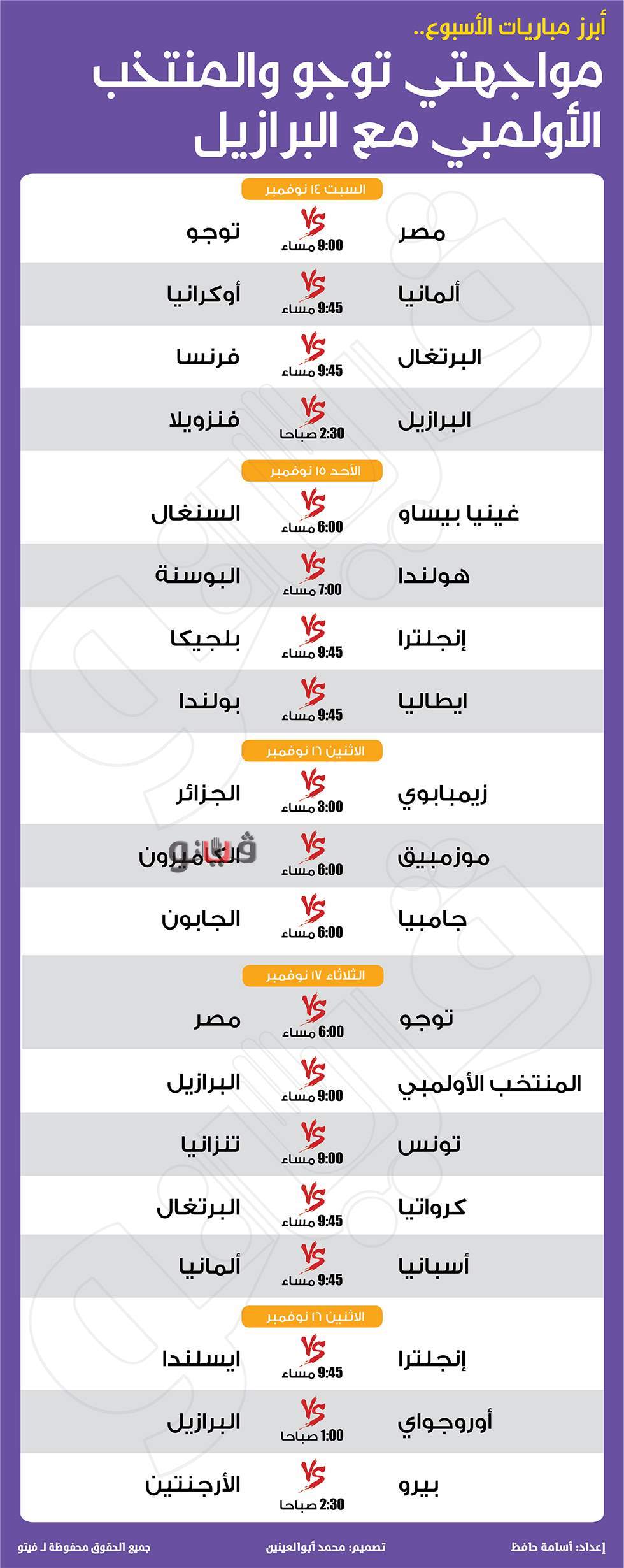مواجهتي توجو والمنتخب الأولمبي مع البرازيل.. أبرز مباريات الأسبوع | إنفو جراف الجمعة 13/نوفمبر/2020 - 09:10 م 11/13/2020 9:10:03 PM تعرف على مواجهات الأسبوع شارك طباعة 18 حجم الخط شارك طباعة تصفيات أفريقيا مباريات الاسبوع مصر وتوجو
