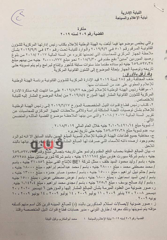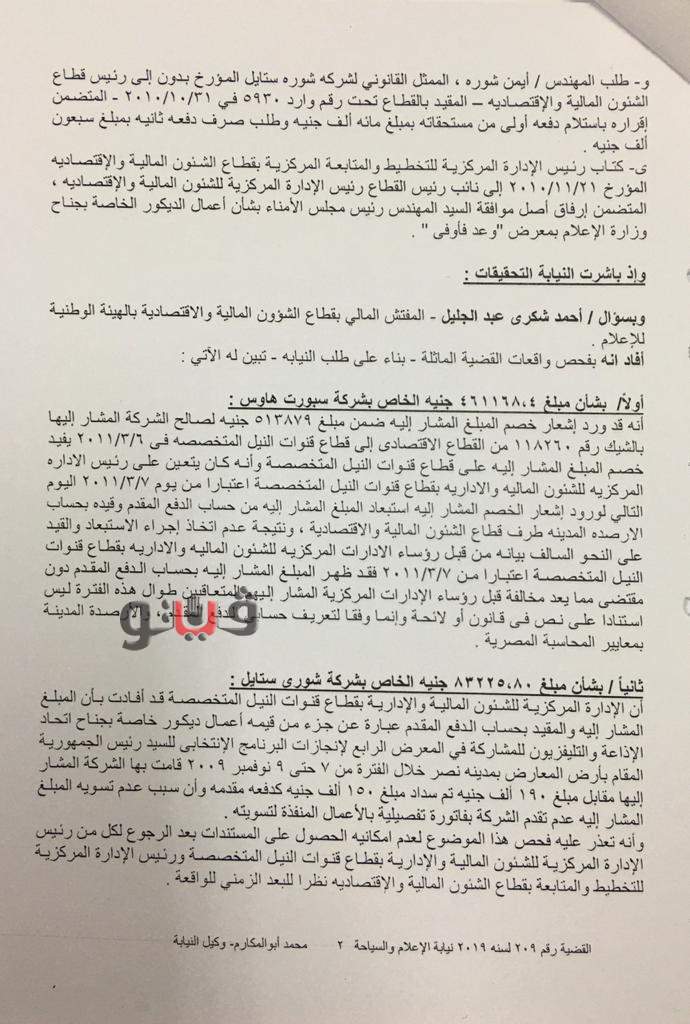وصرف ستة آلاف وثمانمائة جنيه إلى أيمن السيد إسماعيل، لكتابة سيناريو عدد خمس حلقات من برنامج إسكتشات وألف وخمسمائة جنيه إلى عوض مصطفى عوض لكتابة سيناريو وحوار عدد ٣٠ حلقة من برنامج هزار في هزار وخمسة آلاف جنيه إلى مجدي محمد إبراهيم، قيمة أجره كمدير إضاءة لبرنامج الجريئة وسبعة آلاف وسبعمائة وخمسين جنيها إلى إياد صالح يوسف لكتابة عدد ٣٠ حلقه من برنامج إعلانات كوميدي، وقام ماهر سيد أحمد، مسجل بيانات بالإدارة المركزية للتعاقدات بقطاع قنوات النيل المتخصصة بصرف 100 ألف جنيه إلى وليد محمود السيد بشأن التعاقد الخاص ببرنامج نشرة أخبار كوميدي.