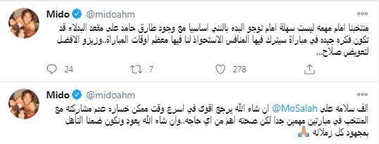 وكتب أحمد حسام "ميدو" تغريدة على تويتر قال فيها: "ألف سلامة على @MoSalah إن شاء الله يرجع اقوى في اسرع وقت ممكن خسارة عدم مشاركته مع المنتخب في مباراتين مهمتين جدا لكن صحته أهم من أي حاجة.. وإن شاء الله يعود ونكون ضمنا التأهل بمجهود كل زملائه".