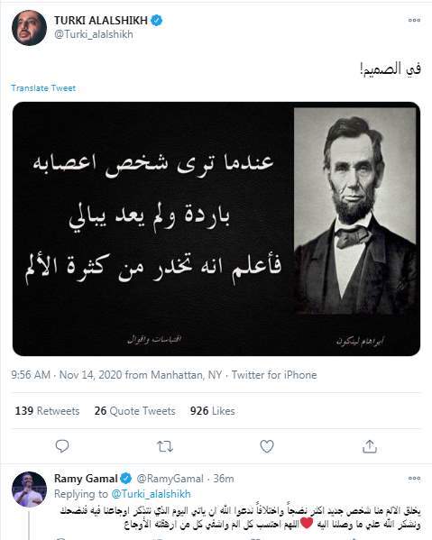 عبر تركي آل الشيخ، رئيس مجلس إدارة الهيئة العامة للترفيه، عن الألم الذي يشعر به بسبب مرض غامض يعاني منه، واقتبس أحد مقولات الرئيس الأمريكي السابق إبراهام لينكولن "عندما ترى شخص أعصابه باردة ولم يعد يبالي.. فاعلم أنه تخدر من كثرة الألم".