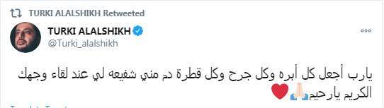 وكان تركي آل الشيخ كتب تغريدة منذ يومين قال فيها "يارب أجعل كل أبره وكل جرح وكل قطرة دم مني شفيعه لي عند لقاء وجهك الكريم يارحيم"