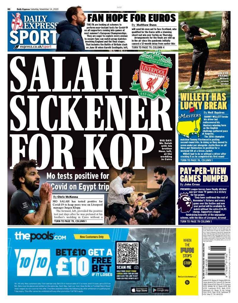 في حين عنونت صحيفة "ميرور"، "موفيد 19"، في إشارة إلى "كوفيد 19" الذي يطلق على فيروس كورونا المستجد، وقالت إن محمد صلاح سيكون مجبراً على الخضوع للحجر الصحي لمدة 10 أيام، مما يعني غيابه بالتأكيد عن مواجهة ليستر سيتي يوم السبت في الجولة التاسعة من الدوري الإنجليزي.