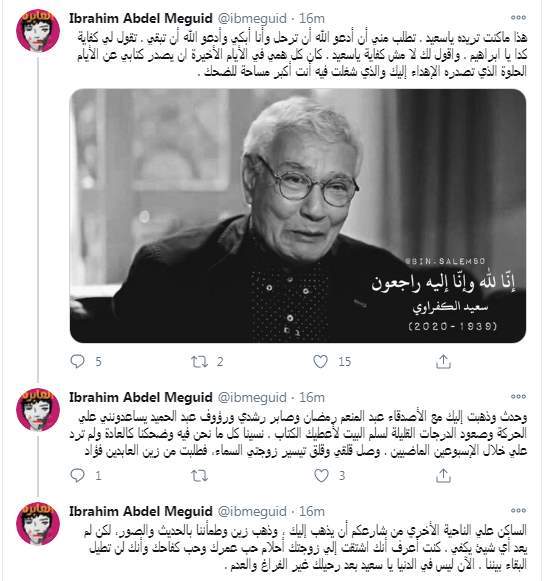 وكتب إبراهيم عبد المجيد تغريدة على تويتر "هذا ماكنت تريده ياسعيد. تطلب مني أن أدعو الله أن ترحل وأنا أبكي وأدعو الله أن تبقي. تقول لي كفاية كدا يا ابراهيم. واقول لك لا مش كفاية ياسعيد. كان كل همي في الأيام الأخيرة ان يصدر كتابي عن الأيام الحلوة الذي تصدره الإهداء إليك والذي شغلت فيه أنت أكبر مساحة للضحك"