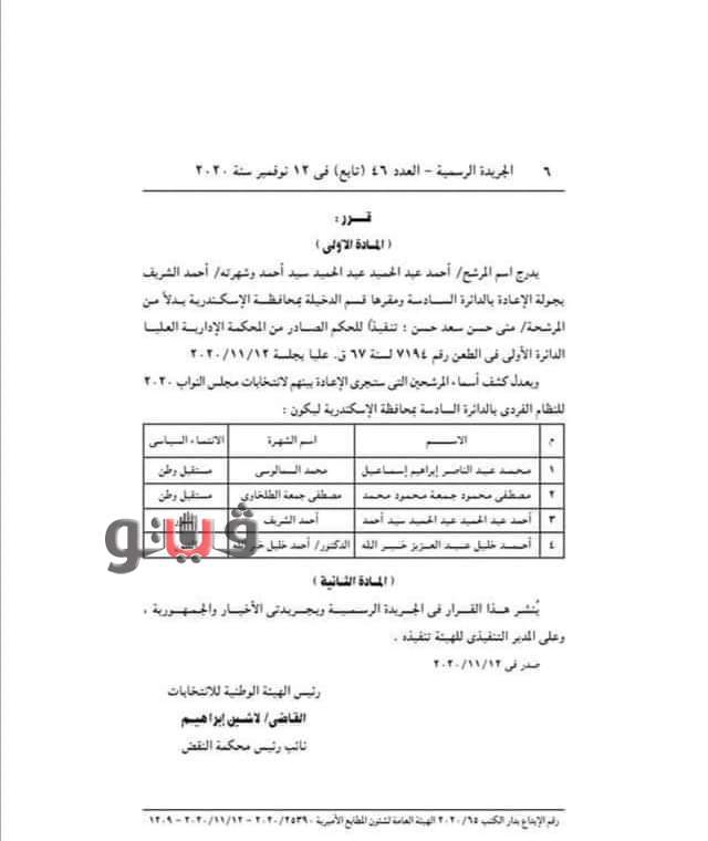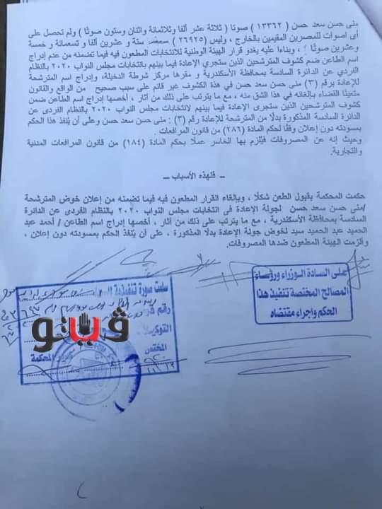 وكان مرشح حزب النور أحمد الشريف، حصل على حكم من المحكمة الإدارية العليا يوم الخميس الماضي، بإدراجها في جولة الإعادة لانتخابات الدائرة السادسة بعد أن أثبت بمحاضر اللجان الفرعية حصوله على ٣٩ ألف ٨٠٧ صوتا بدلا من ٢٦ ألفا و ٢٠٤ أصوات، وحصول المرشحة منى الحسيني التي دخلت الإعادة على ١٣ ألفا و٢٦٢ صوتا بدلا من ٢٦ ألفا و٤٠٥ صوت، ونفذت الهيئة العليا للانتخابات قرار المحكمة.